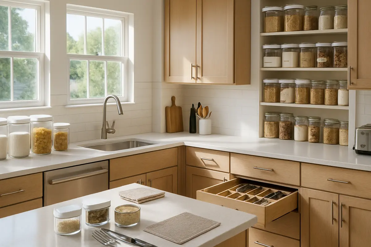 Cozinha espaçosa impecavelmente organizada com luz natural pela manhã, mostrando bancadas limpas e itens diários dispostos com potes transparentes e prateleiras etiquetadas